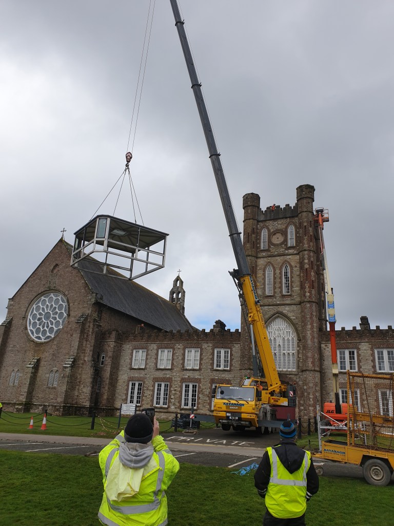 The Whitechapel Foundry Bells were removed from the Belfry above the Pugin Chapel and replaced with all new cradles and electronically controlled clappers, enabling the bells to chime on the hour and twice daily for the Angelus.