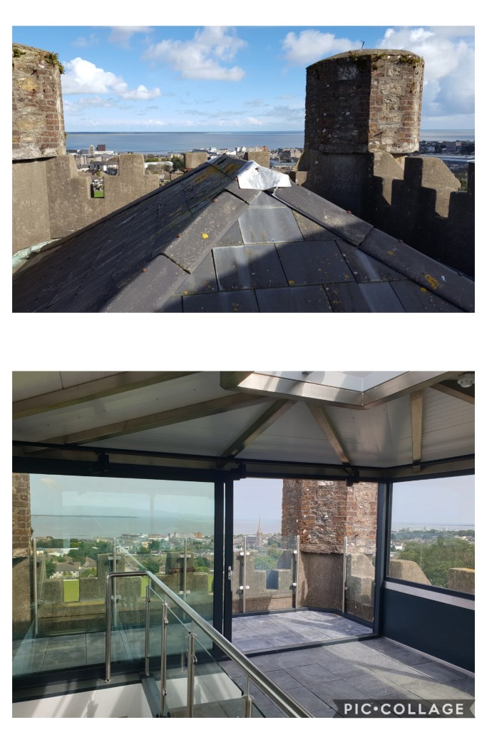 The Tower Roof was replaced and then fitted with a custom made viewing cabin to access the impressive views of Wexford and the surrounding areas. A new stairs was required to access the roof from the upper floor of the tower. A new clock was manufactured and fitted to the front façade of the tower while St. Peter’s College Crests were manufactured and fitted to the other three sides. For safety, a glass balustrade was fitted to the turrets on the external viewing terrace.